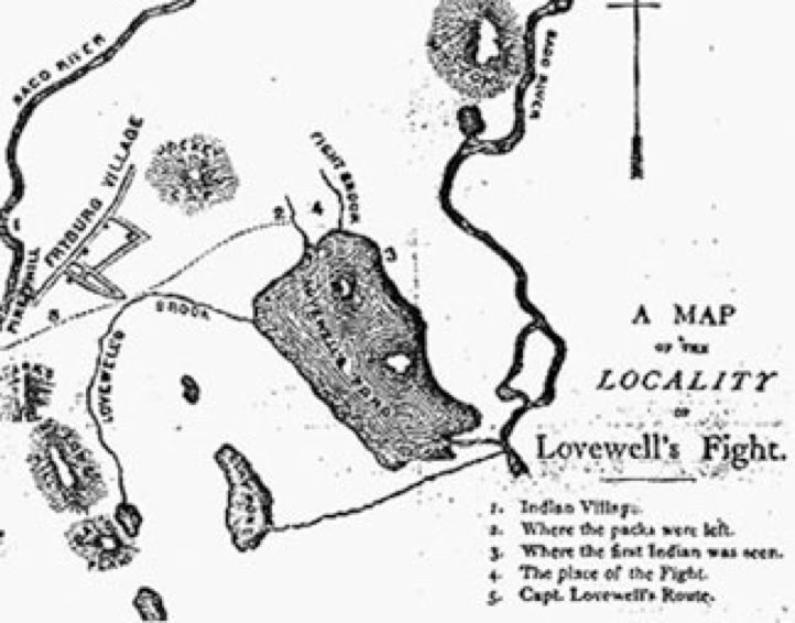 Map from Bouton's Original Account shows the area of the fight along with late 18th century Fryeburg Village.