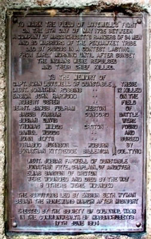Partial List of Sources: Barrows, John Stuart. Fryeburg, Maine: An Historical Sketch. Fryeburg, Pequawket Press, 1938. Belknap, Jeremy. The History of New Hampshire. Dover: S.C. Stevens & Ela & Wadleigh, 1831. Chamberlain, George W. "John Chamberlain, the Indian Fighter at Pigwacket" Collections of the Maine Historical Society, Second Series, Volume IX. Portland: Maine Historical Society, 1898, pp. 1-14. Fox, Charles J. The History of the Old Township of Dunstable: Including Nashua, Nashville, Hollis, Hudson, Litchfield, and Merrimac, N.H.: Dunstable and Tyngsborough, Mass. Nashua: Charles T. Gill, Publisher, 1846. Green, Samuel A. Groton during the Indian Wars. Groton, MA, 18813. The Nashua History Committee. Kidder, Frederic. The Expeditions of John Lovewell and his Encounters with the Indians. Boston: Bartlett and Halliday, 1865. The Nashua Experience. Nashua, NH: Nashua Public Library and Phoenix Publishing, 1978. "Memoir and Journals of Rev. Paul Coffin, D.D., of Buxton, Me.: Journal of a Tour from Buxton to Piggwacket, 1768". Collections of the Maine Historical Society, Series 1, Vol. 4. Portland: Maine Historical Society, 1856, pp. 275-292. Parkman, Francis. "So Thick and Fast They Fell," Williams, Ben Ames, ed. Amateurs at War: The American Soldier in Action, Boston: Houghton Mifflin, 1943. Smith, Marion Jaques. A history of Maine. Portland, ME: Falmouth Publishing House, 1949. Symmes, Thomas. The Original Account of Capt. John Lovewell's "Great Fight" with the Indians at Pequawket, A new edition with notes by Nathaniel Bouton. Concord: P.B. Cogswell, Printer, 1861.