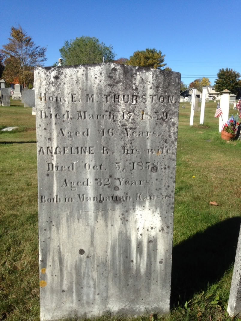 E.M. (Elisha Madison) Thurston and his wife Angeline drew my interest because they died in Manhattan, Kansas in the period before the Civil War when the American people struggled mightily with the issues of slavery and the balance of power between the North and South. Kansas was at the epicenter of one of these struggles. Orator and Senator Stephen A. Douglas's Kansas Nebraska Act of 1854 called for popular sovereignty in deciding whether the two territories would be admitted as slave states or free. In other words, the people in the territory would vote and decide for themselves what their state would be.