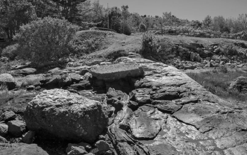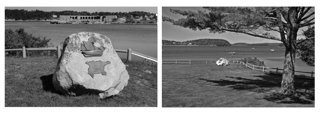 Two views of Popham today: The Virginia commemorative rock with Fort Popham in the background (left) and a view from the parking lot across the excavation site. David Higgins photos