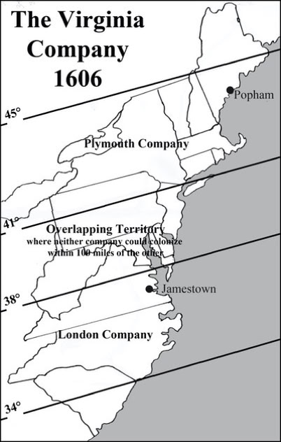 By the time of Waymouth’s return a completely new game plan for colonization was afoot. In April of 1606 King James I signed a charter for the Virginia Company with the express purpose of establishing colonies in North America. The Virginia Company was actually composed of two joint venture stock companies and modeled after an early version of the East India Company, a trading monopoly of London merchants chartered by Elizabeth in 1600. The two Virginia companies were nearly identical except for their theaters of operation. The LondonCompany, so named because its primary investors were London merchants under the leadership of the king's Secretary of State Sir Robert Cecil, were granted rights of settlement and trade between the 34th and 41st parallels. The Plymouth Company, composed largely of gentlemen and merchant investors from the West Country and centered around Plymouth with Chief Justice Popham at their head, were granted lands between the 38th and 45th parallels. It was further stipulated that each company's territory extended 100 miles inland from the coast and that no colony could be established within 100 miles of the other company's colony, thus the overlap. This neutral zone would eventually be added to the area of the first company to establish and maintain a stable colony. The primary objective was, of course, to make money for the investors and the crown who was to receive 20% of the net profits from precious metals, however, the king retained absolute control of the colonies. It seemed a good deal and, in light of all the exploration propaganda, a sure fire moneymaker.